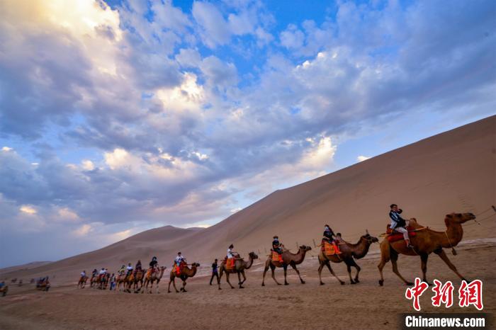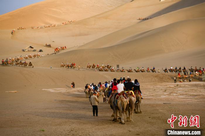 圖為游客騎駱駝暢游鳴沙山?!⊥醣筱y 攝
