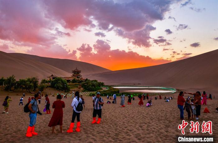 圖為游客觀賞月牙泉晚霞美景。 王斌銀 攝