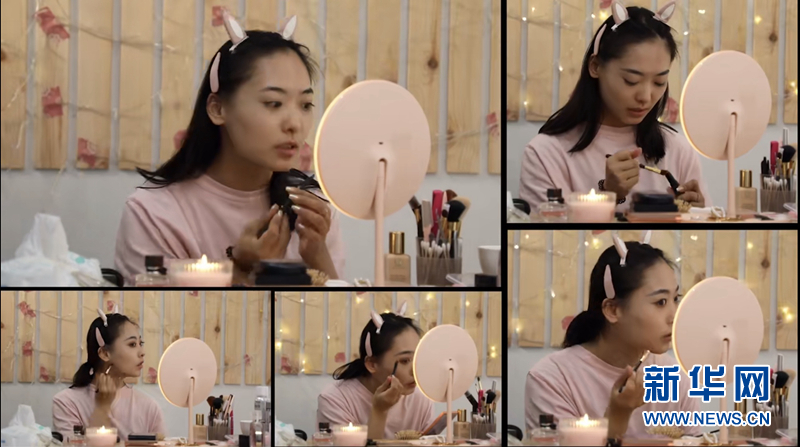 化妝鏡、美妝工具、閃爍的背景燈,在臨時搭建的“直播間”里,班銳開工了。