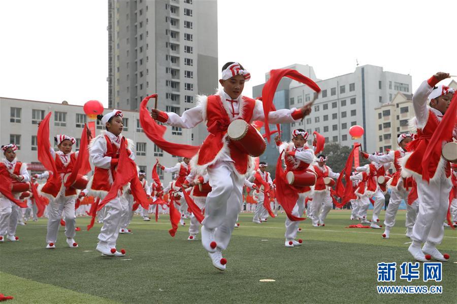 11月4日,蘭州市桃樹坪小學(xué)學(xué)生在活動現(xiàn)場表演歡慶腰鼓。當(dāng)日,甘肅省蘭州市城關(guān)區(qū)學(xué)校體育“一校一品”現(xiàn)場展示活動在蘭州市第五十四中學(xué)舉行,16所學(xué)校進行了特色校園體育項目表演。據(jù)介紹,蘭州市城關(guān)區(qū)現(xiàn)已推廣各類體育項目40余項,命名“體育特色項目示范校”42所。 新華社記者 張智敏 攝