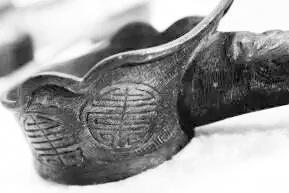讓我們先看看這個(gè)熨斗:這是一件漢代家庭使用的生活工具,從外形來看,它通長(zhǎng)28厘米,柄長(zhǎng)16厘米,勺徑12厘米。柄、勺分別鑄造后焊接而成,勺圓口,寬折沿,微侈,圓腹,圓底,外沿下一圈弦邊。沿下焊柄,柄呈平面,圓底條狀,柄首呈張口龍頭形,勺內(nèi)有黑色炭跡。這是兩千年前漢代人使用時(shí)留下來的痕跡。在勺的外側(cè),還有一塊類似銘文的東西。