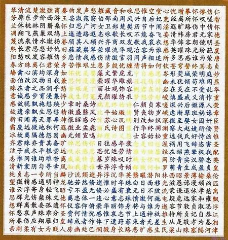 蘇蕙《璇璣圖》不僅是一束厚重的文學(xué)奇葩,也是一幅充滿創(chuàng)意的藝術(shù)巨制。她將詩歌的載體從傳統(tǒng)簡帛紙張轉(zhuǎn)換成為錦。錦是有彩色花紋的高級絲織品。以錦為書寫材料制作《璇璣圖》,除詩歌本身的創(chuàng)作外,首先需要染絲紡織。錦織好后,又要對《璇璣圖》謀篇布局,劃區(qū)設(shè)色,書詩于錦,然后一針一針地將它繡出來,變?yōu)榛匚腻\字。那每一道工序,要求都極精細,不得有半點疏忽,不然就會留下污點和遺憾。蘇蕙集眾藝于一身,完美地將其制作出來,體現(xiàn)了她的綜合藝術(shù)才能。取名“璇璣(泛指北斗)圖”,寓意它像北斗,可以旋轉(zhuǎn)地讀。它是在華美的錦上,又以五彩繽紛的絲線繡上《璇璣圖》,不僅顏色更加艷麗,而且那841個金玉珠璣般文字,展現(xiàn)的令人眼花繚亂的詩歌園地,更是前不見古人,后不見來者,比錦繡的光彩更加耀眼奪目。