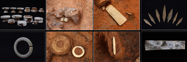 巖山寨遺址總面積約5萬平方米,包含居住區(qū)、墓葬區(qū)等多個功能區(qū)。居住區(qū)發(fā)現(xiàn)大量灰坑、柱洞,也夾雜少量墓葬,居住生活和喪葬并未完全分開。墓葬區(qū)共發(fā)掘墓葬66座,可見一次葬、二次葬和遷出葬現(xiàn)象,少數(shù)墓葬保存了木質(zhì)葬具殘痕與人骨遺存,這在嶺南同類遺址中極為罕見。隨葬陶器組合以鼎、盤、豆、壺、罐為主,磨制石器以鏃、錛為主,玉器有琮、鉞、環(huán)、玦、璧、錛、錐形器及圭形器等,以玉鉞為最大宗。墓葬形制、喪葬禮俗及隨葬器物組合都具有顯著的石峽文化特征。墓葬表現(xiàn)出明顯的等級分化,高等級墓葬普遍隨葬玉器,其中M16隨葬品超過140件,包括5件玉鉞與2件玉環(huán),M26則同時隨葬有玉琮與玉鉞。