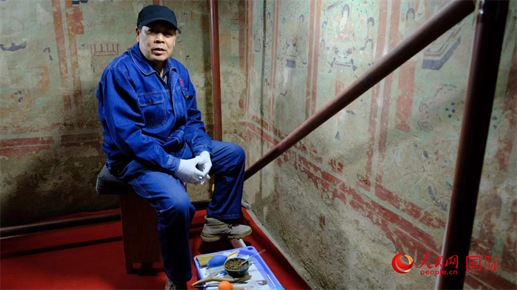 敦煌研究院文物保護(hù)修復(fù)工作者劉濤在工作現(xiàn)場。人民網(wǎng) 呂強(qiáng)攝