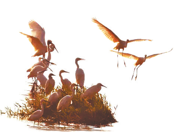 去年12月底,一位老師來西峰講學(xué),我陪先生到濕地海綿公園轉(zhuǎn)悠,剛剛步入人行道,發(fā)現(xiàn)遠處湖水中央有七八只白鷺在棲息,朝陽斜射到湖面上,水波瀲滟,像細碎的金斑,白鷺安詳?shù)叵礈熘鹈?,有一只白鷺單腿直立著,恰似依著一根筆直纖細的鐵絲,半張著翅膀,欲飛不飛的樣子,剩下的幾只白鷺在戲水,迷人極了。