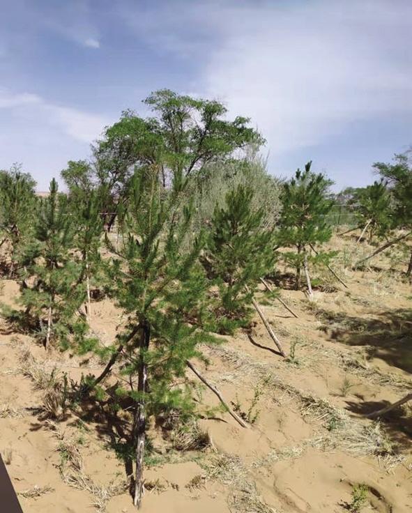 我和同伴撲進(jìn)沙海柔軟的懷抱。認(rèn)識到,再小的沙粒,也不能與塵世隔絕,我與沙,結(jié)緣于此。沙海里,一沙一世界。黃沙大膽赤裸地暴露在天幕蒼芎下,以大,以小,涵納無窮。“沙沙”的足音里,印下我深深淺淺兩行腳印,宣告著浪漫與踏實的存在。我來到習(xí)近平總書記親手栽植的“五棵松”下,仰視青松,綠云葳蕤,生機(jī)勃勃。總書記的關(guān)懷和鼓勵,黃沙熱熱地、輕輕地長出了更多綠色羽翼,這羽翼在不斷地生長壯大,有“代代相傳”的精神,綠色終究會覆蓋全部騰格里。捧起一捧黃沙,細(xì)沙像嬰兒肌膚般的柔滑,我試圖用臉貼近它,這些黃色的小精靈,從我指縫間輕盈地流淌到松下,似乎在暗示我,要把自己的夢筑進(jìn)治沙精神的瀚海里??茖W(xué)家們已作出結(jié)論:沙漠是人類最后的寶地,別看它現(xiàn)在荒蕪,它里面蘊(yùn)藏著無盡的寶藏和財富。