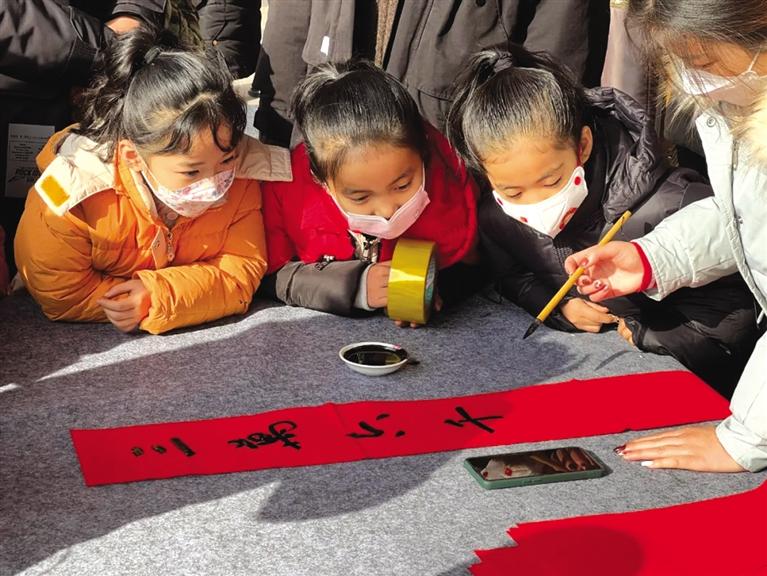 “千門萬(wàn)戶曈曈日,總把新桃換舊符”。書(shū)法老師們提筆蘸墨,行云流水,落筆如云煙,寫成了一副副寓意吉祥美好的春聯(lián)。孩子們懷著一顆顆憧憬之心,圍繞在老師們的周圍,幫忙擺放、晾曬春聯(lián)。最后,孩子們將老師寫好的春聯(lián)送給了爸爸媽媽,以及前來(lái)參觀的游客們。