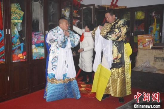 2月16日,表演者正在甘肅蘭州市永登縣苦水街穿上傳統(tǒng)戲服,準備高高蹺表演。 九美旦增 攝