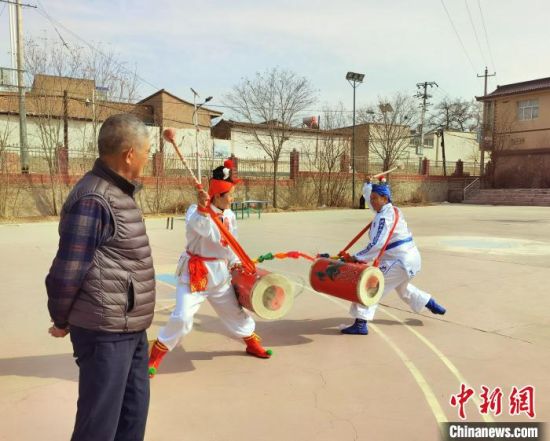 春寒料峭,中新網(wǎng)記者走進(jìn)蘭州市榆中縣金崖鎮(zhèn)陸家崖村,帶隊(duì)女子太平鼓隊(duì)近30年的陸鵬飛指導(dǎo)隊(duì)員訓(xùn)練?!堟骸z