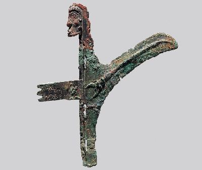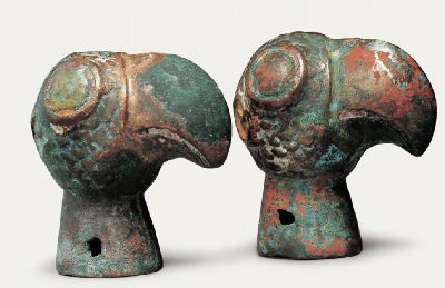 鷹是一些游牧民族崇拜的猛禽,十分威猛。青銅鷹首為軸桿類(lèi)頂端的飾物,部族首領(lǐng)手執(zhí)桿頭有鷹首的器物以象征權(quán)威和神圣。