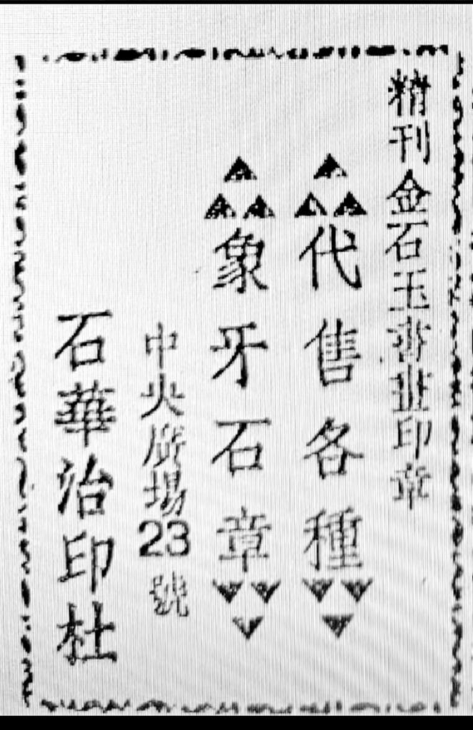 最后要提到的一則廣告也與文化有關(guān)。蘭州和平日報社1947年出版的《新蘭州》一書中,曾刊登石華治印社廣告,其廣告詞曰:“精刊金石玉書畫印章、代售各種象牙石章”,社址在中央廣場23號,其創(chuàng)辦者即為隴右印壇名宿駱石華先生。駱石華先生1920年生人,彼時未及而立,尚未入白石先生門下;筆者家外祖解放前供職中央廣場郵局,當年曾與石華先生相交。今偶于舊籍中覓得石華治印社當年廣告,恭錄于此,既為本文收尾,亦為家外祖與石華先生半個世紀友誼之緬懷。