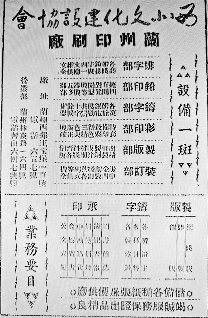 個別有實力的印刷廠也通過廣告拓展業(yè)務(wù)。如創(chuàng)辦于1947年9月的西北文化建設(shè)協(xié)會蘭州印刷廠是當時甘肅規(guī)模較大的印刷廠之一,曾印制過《蘭州古今注》《花兒集》《西北論叢》《新光》等書刊。據(jù)當年廣告所載,該廠內(nèi)設(shè)排字部、鉛印部、鑄字部、彩印部、制版部、裝訂部,承印范圍亦頗廣,包括圖書雜志、傳記表報、信箋信封、中西講義、商標廣告、公文表格等。