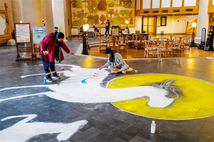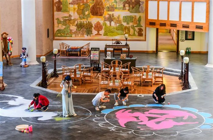 5月8日,母親節(jié),酒泉敦煌市沙文化館以敦煌莫高窟九色鹿壁畫為摹本,以彩色沙為原料,5人團(tuán)隊(duì)通力合作,在敦煌鳴沙山下的敦煌山莊大堂“繪制”出長10米寬6米的大型九色鹿沙畫,同時(shí)“繪制”了一幅“三兔藻井”沙畫圖案,寓意天下母親“福祿安康”“一路平安”,祝天下母親節(jié)日快樂。