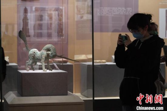 5月18日,游客來(lái)到位于蘭州的甘肅省博物館內(nèi)參觀《大道攸歸:五涼文化展》。圖為“銅獨(dú)角獸”?!【琶赖┰觥z