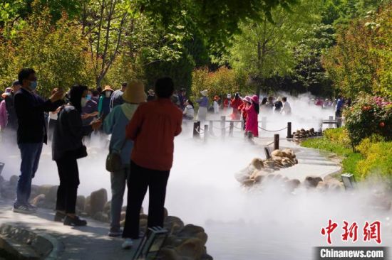 5月16日,甘肅蘭州,寓言故事園化身“瑤池”仙境美景,吸引不少市民前來觀賞、拍照。