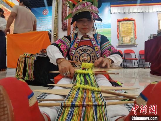 中新網甘肅張掖6月8日電 (閆姣)腳蹬紡織板,手持木梭子,甘肅甘南藏族自治州舟曲縣藏族姑娘全庸卓瑪坐在地上,展示省級非遺織錦帶,藏族婦女用其束腰、扎靴。她說,這項技藝后繼乏人,希望通過這種“走出去”的活動,讓更多人了解這一獨特文化。
