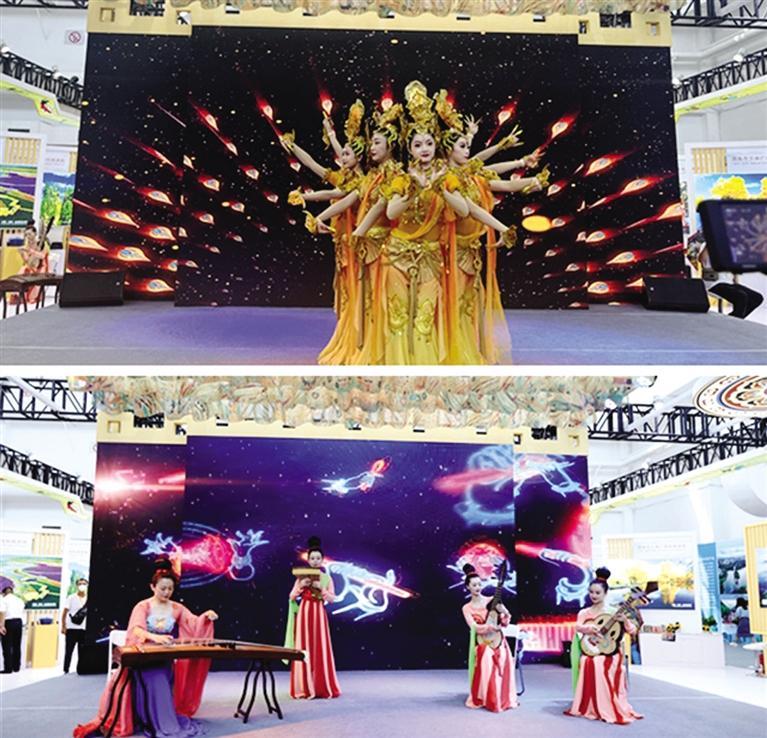 甘肅展區(qū)舞臺上,身著古裝的演員們生動演繹著《千佛》《散花飛天》《反彈琵琶長綢舞》等極具甘肅特色的敦煌古樂和敦煌舞蹈,令游人流連忘返。