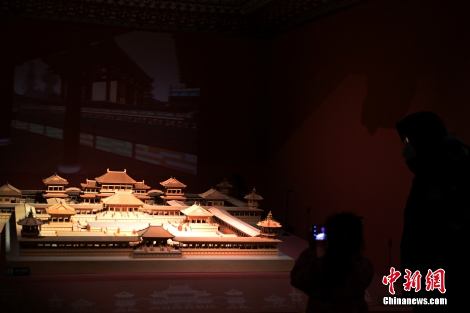 游客正在參觀“千年?duì)I造——敦煌壁畫(huà)中的建筑之美”特展上出自莫高窟第419窟的火焰券方形龕模型。(中新社記者 李亞龍 攝)