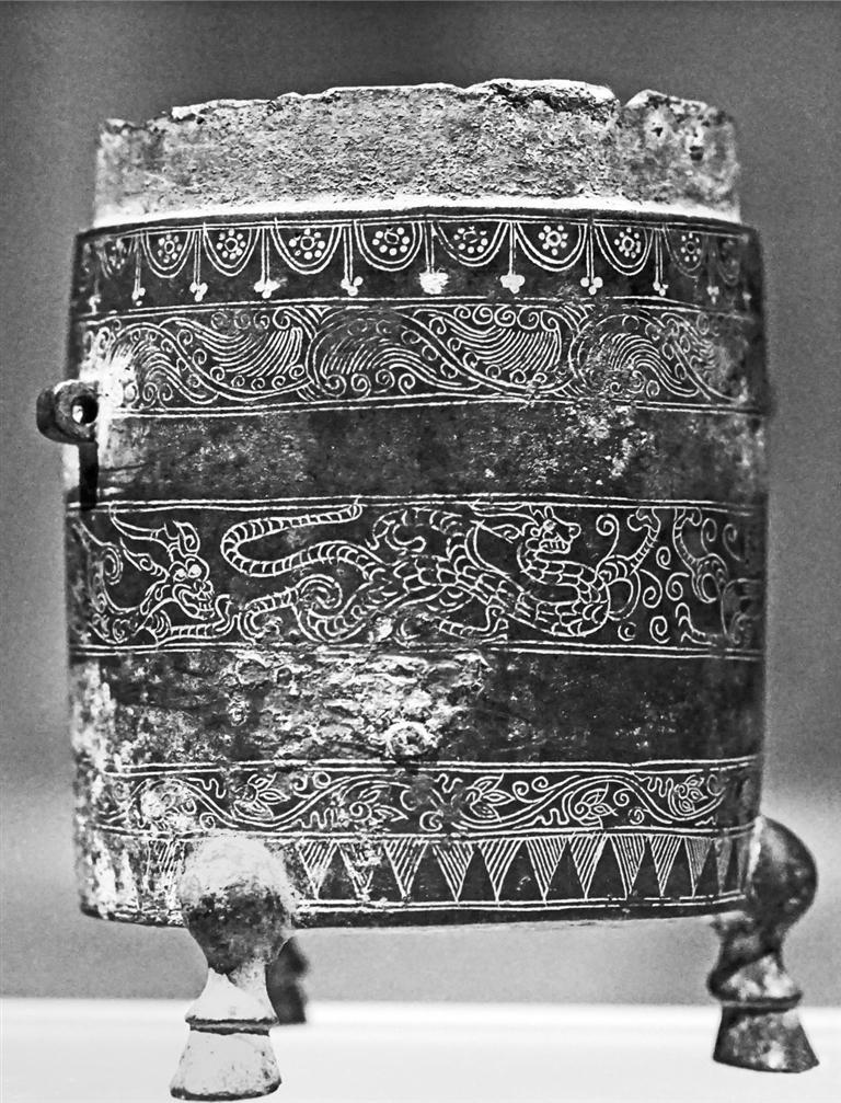 這件金錯泥筩,是目前發(fā)現(xiàn)的唯一一件可以確定的、與前涼張氏王族有關的宮廷用器。征集于西安,可能是公元376年,前涼末主張?zhí)戾a投降前秦后前往長安時帶去的。