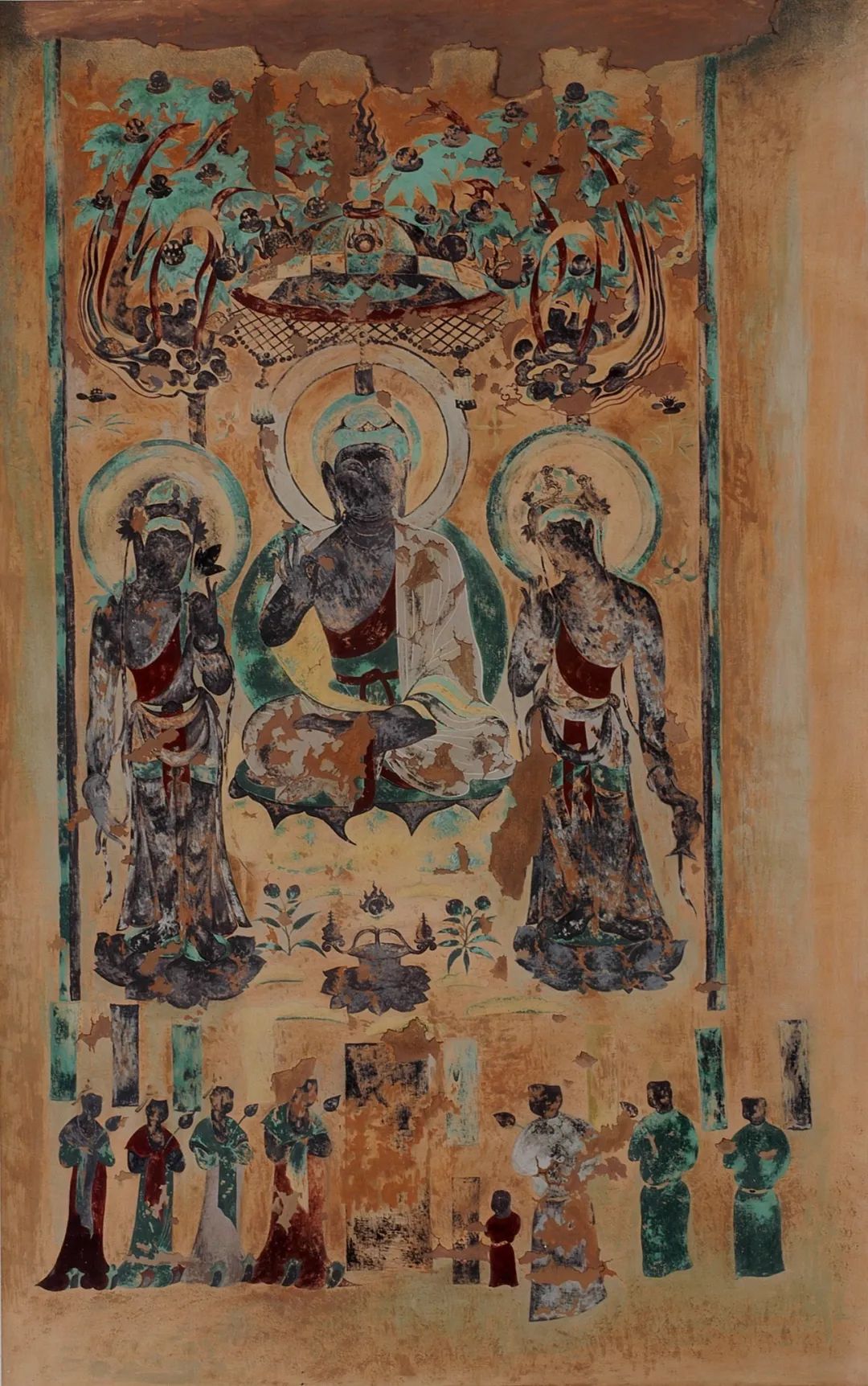 此外,第4窟后室大龕之間的墻壁上方保存有多幅唐代繪制的佛說(shuō)法圖、供養(yǎng)菩薩、跪拜供養(yǎng)人形象。造像題材以一佛二弟子二菩薩組合為主,兼有傳統(tǒng)的三佛造像。