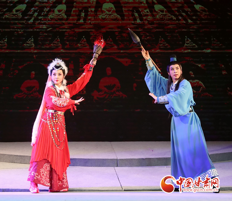 隴劇《敦煌》以回鶻族公主格麗莎的命運(yùn)軌跡為結(jié)構(gòu)框架和發(fā)展脈絡(luò),描繪了一幅炎黃子孫在血與火的洗禮中,保護(hù)中華民族文化的宏偉畫卷,充分詮釋了敦煌文化“美人之美”“美美與共”的開放胸襟,“止戈為武”“協(xié)和萬邦”的和平思想,“和為貴”“和而不同”的東方智慧以及“自強(qiáng)不息”的奮斗精神、“舍生取義”犧牲精神。