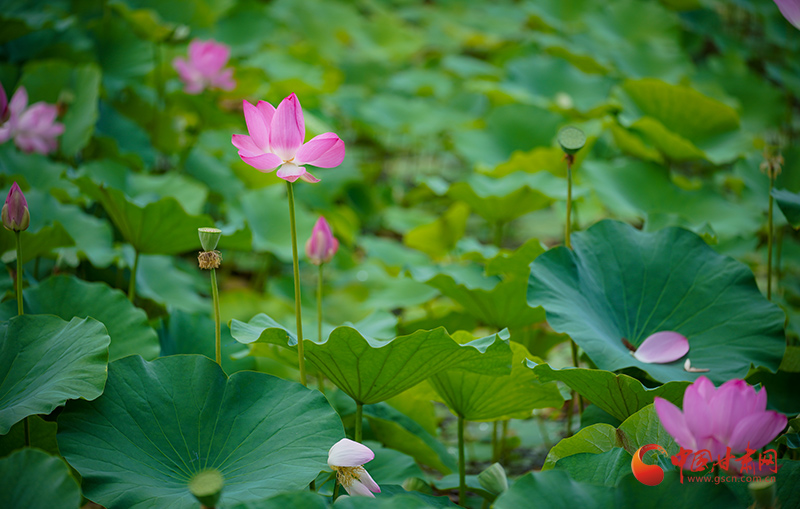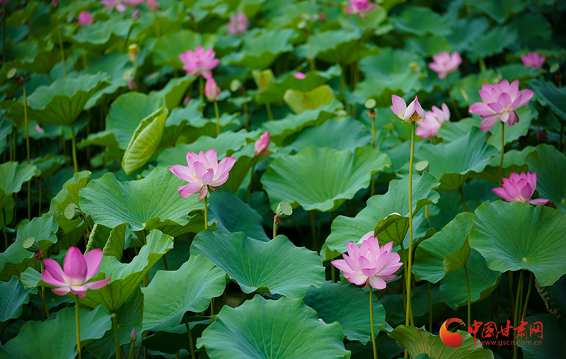 盛夏時(shí)節(jié),甘肅成縣裴公湖的荷花爭相盛開,吸引大批游客前來觀賞,拍照打卡。