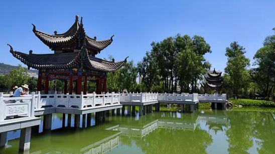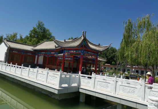 為景點命名。綜合考察廣河歷史文化遺存,細致視察公園營造之特色,遂將其命名為大夏公園,并結(jié)合園內(nèi)景點布局、建筑特色、用途等,為亭、榭、湖、軒、橋等景點命名,如齊家亭、半山亭、天保廊、鐘鼎山房等。最讓人心曠神怡處,當為波光粼粼的湖面,因形狀頗似如意,故命名為如意湖,而分東西橫臥在湖面最狹窄處的兩座握橋,分別命名金龍橋、玉鳳橋。