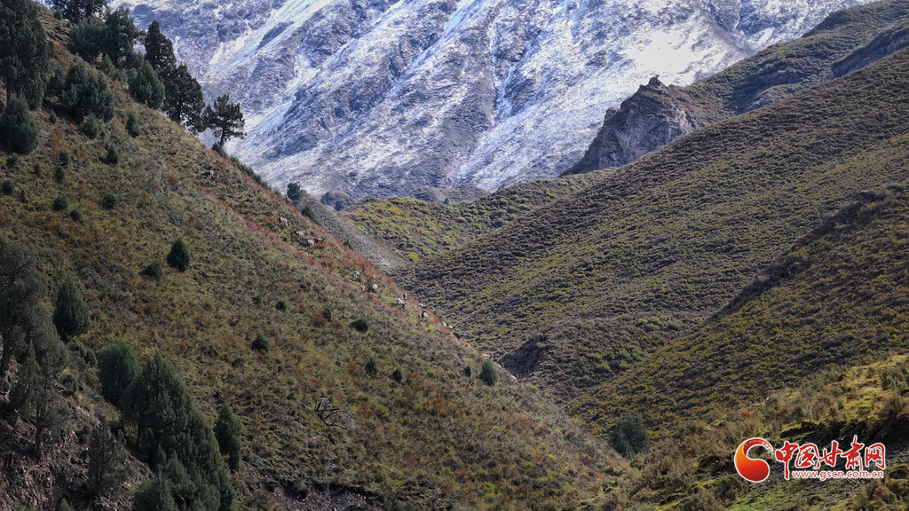 9月25日,位于甘肅省河西走廊的張掖市山丹馬場秋日初雪,遠處的祁連山上積雪與松柏交相輝映,巖羊在雪地里悠閑覓食,宛如一幅和諧的生態(tài)畫卷。