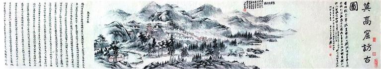 民國(guó)初年,張維返回蘭州之后,仍然念念不忘敦煌經(jīng)卷,曾三赴河西考察敦煌莫高窟。1940年,張維第三次考察敦煌莫高窟返回途經(jīng)武威時(shí),前往拜訪好友、甘肅近代著名書畫家范振緒,為其講述敦煌莫高窟的坎坷境遇與現(xiàn)狀。在交流中,張維請(qǐng)范振緒繪制《敦煌訪古圖》畫卷。1941年,范振緒繪制完成之后,張維將此圖帶回蘭州,并邀請(qǐng)張大千、于右任、高一涵、馮國(guó)瑞、曹經(jīng)沅等著名詩(shī)人題詠。