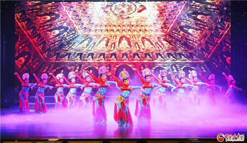 除了甘肅省民族歌舞團和西北民族大學舞蹈學院聯(lián)袂獻上的精彩節(jié)目外,當晚,肅州區(qū)文化館還為觀眾奉獻了舞蹈《西域羯鼓》。據(jù)悉,羯鼓源自西域,狀似小鼓,兩面蒙皮,均可擊打,既能表現(xiàn)快速緊急或激烈的情緒,又可以用散淡悠長來營造靜謚雅致的氛圍。表演中,舞者著霓裳,帶搖冠、掛嚶珞,貼著金花的衣裙飄曳、巾帶飛舞,四周天花飛落,如夢如幻。該節(jié)目通過歡快的音樂、輕快的舞步、流暢的隊形變換等形式,展現(xiàn)了極具特色民族舞蹈風格,也反映了隴原兒女團結奮進、昂揚向上的精神面貌。