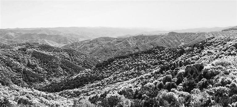 離開黃帝陵園,沿省道繼續(xù)行進(jìn),逐漸進(jìn)入了高原林海。四面山川勾連,丘谷交織,全被森林覆蓋。無數(shù)高峻的山嶺如群龍盤繞,道道山脊線條分明,錯(cuò)落有致,茂密的林木在冬寒中襯成一派青藍(lán)底色,常綠的松柏又在林海中開拓出成片蒼翠。極目遠(yuǎn)望,在正午的陽光照耀下,林海風(fēng)煙彌漫,顯出一種天地間的浩然之氣。