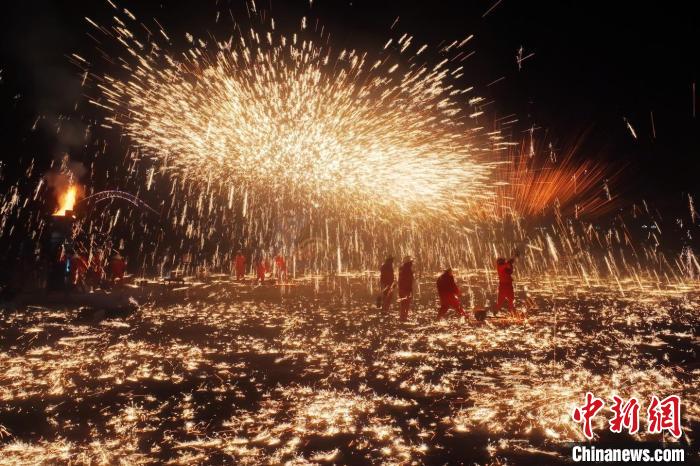 永靖王氏鑄造技藝傳承人在永靖黃河岸邊表演了國(guó)家級(jí)非物質(zhì)文化遺產(chǎn)“打鐵花”,讓民眾享受了一場(chǎng)視覺(jué)盛宴。侯奇志 攝