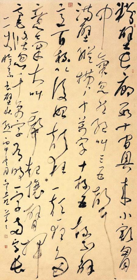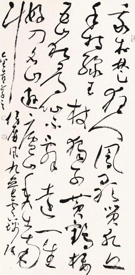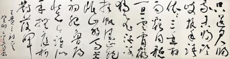 走出去,站在全國(guó)的高度,集中進(jìn)行學(xué)習(xí)和交流,對(duì)一個(gè)立志進(jìn)取的書法家,可以說(shuō)是一個(gè)脫胎換骨的修煉,中國(guó)書法發(fā)展的當(dāng)代狀態(tài),成為進(jìn)取的最大參照,風(fēng)格極力貼近時(shí)代風(fēng)尚,在此基礎(chǔ)之上加入個(gè)人的鮮活語(yǔ)素,在作品中即表現(xiàn)出了時(shí)尚,又有自己的構(gòu)想,才有自己的一席之地。侯金喜抓住時(shí)代脈搏,積極捕捉在展覽中尚處于不顯眼的元素,不斷加以顯化,使個(gè)人的作品在龐大的展出體系中獨(dú)具風(fēng)采,難度可想而知,在高手如林的態(tài)勢(shì)下,侯金喜知難而上、刻苦磨煉,向經(jīng)典取法,向當(dāng)代名家問(wèn)路,雙向融合、求新求變,經(jīng)過(guò)了這樣一個(gè)長(zhǎng)的時(shí)段的求索,他的草書在全國(guó)眾多的草書家中拔地而起,引發(fā)了廣泛的關(guān)注??此牟輹兓亩劝盐赵诹艘粋€(gè)比較妥帖的度上,他不以奇異詭變?yōu)槌缟校P畫塑造大體以傳統(tǒng)語(yǔ)言為宗,使柔和與剛健統(tǒng)馭在一起,這種立意基本圍繞中國(guó)書法流變的中軸線,可以受到時(shí)間的考驗(yàn),在一些筆畫中注入的時(shí)代信息,經(jīng)過(guò)個(gè)人的藝術(shù)提煉,具有了新的生氣。在結(jié)構(gòu)選擇上,他同樣進(jìn)行了深思熟慮,反復(fù)篩汰了過(guò)度追求時(shí)髦的招數(shù),一直強(qiáng)調(diào)深層次的內(nèi)涵,把一個(gè)結(jié)體放在歷史的縱向上反復(fù)琢磨,他自己認(rèn)為,形象造型只有沿著時(shí)序的推進(jìn),才能有機(jī)地融入歷史,成為藝術(shù)的終極選擇,所以侯金喜的探索是審慎的,邁進(jìn)是疊復(fù)的,我們欣賞他的作品,可以看出他思考的勤謹(jǐn),每一個(gè)階段都有不同的表達(dá),欣賞者隨著他的筆觸的流瀉,可以領(lǐng)略到豐富的視覺(jué)享受。
