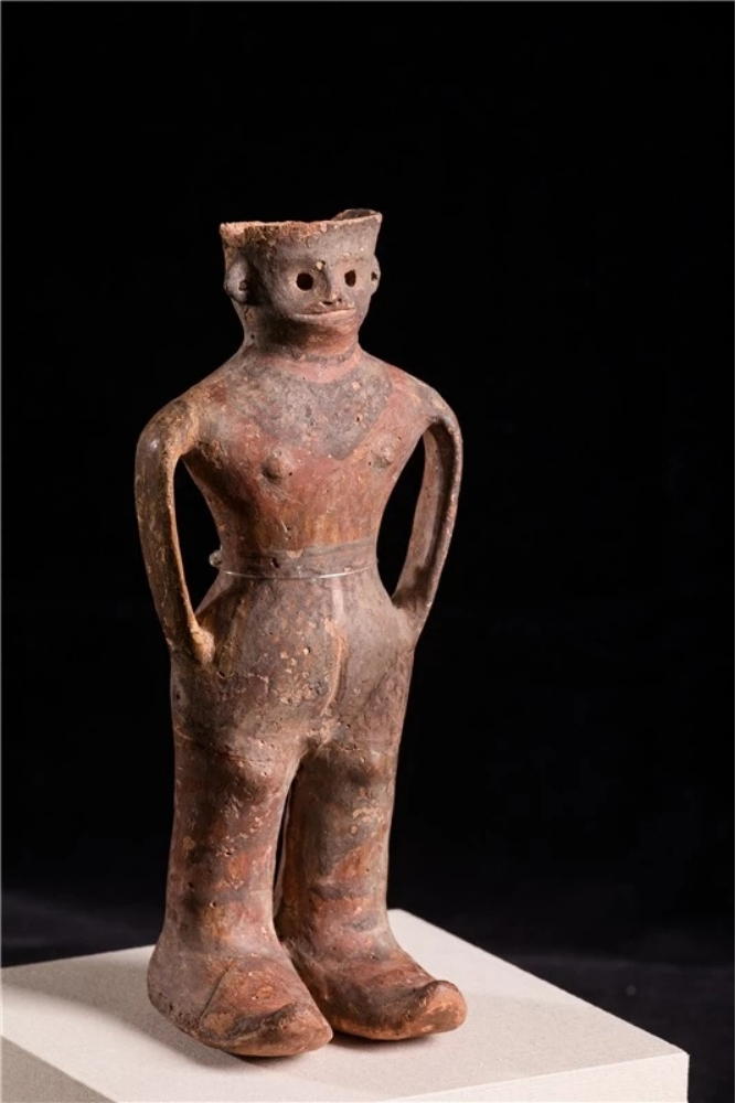 “河西少年”——人形彩陶罐出土于火燒溝遺址,國家一級(jí)珍貴文物, 1990年作為甘肅省選送的8件精品文物之一在舉辦第十一屆北京亞運(yùn)會(huì)期間向中外游客展出。遠(yuǎn)看是一名雙手插兜站立的酷少年,其體 態(tài)、動(dòng)作和神情刻畫得栩栩如生;走近一看,人像短發(fā)、高鼻深目、雙耳開孔、表情生動(dòng),其身 著短上衣,頸部至胸前的網(wǎng)格紋就像是戴有精美的項(xiàng)飾,下身著網(wǎng)格長褲裙,雙手插在褲兜里, 碩大的雙腳上穿著肥大的高腰靴子,一副怡然自得的樣子。陶罐人體中空,可以盛水, 插入褲兜的雙臂形成陶罐的雙耳,設(shè)計(jì)大膽,制作精巧。2023年玉門市博物館參加的騰訊探元文化創(chuàng)新大賽“古物換新樣”中,“河西少年”成為追捧的對(duì)象,在眾多參賽作品中脫穎而出,被很多設(shè)計(jì)師設(shè)計(jì)成了背包、花盆、臺(tái)燈、盲盒等文創(chuàng)產(chǎn)品。