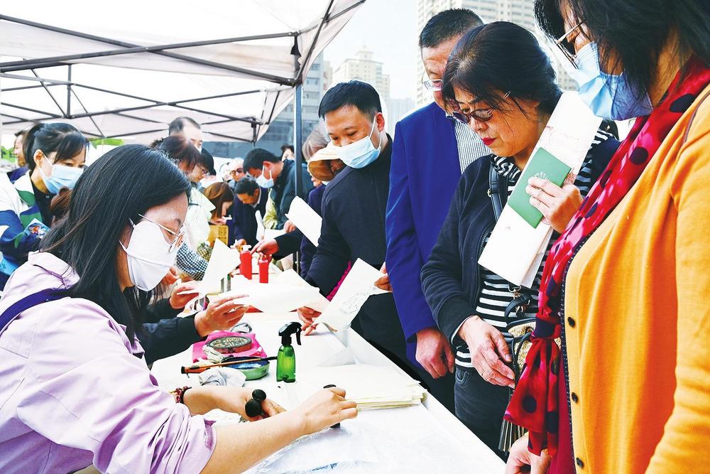 活動現(xiàn)場,甘肅省圖書館的工作人員帶領(lǐng)讀者體驗傳拓之美。 新甘肅·甘肅經(jīng)濟日報記者 瞿娟 攝