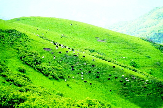 秦人遠去了,只留下那些讓后人至今懷想不已的地名,諸如石鼓山、景墩梁、牧馬梁、上店子、下店子、大卜峪、瓦泉峪等,而尤以石鼓山最為著名,著名得連那部白發(fā)三千丈的《水經(jīng)注》里,都記載著它的故事:“山在梧中聚,有石鼓不擊自鳴,鳴則兵起。漢成帝鴻嘉三年,天水冀南山有大石自鳴,聲隱隱如雷,有頃止,聞于平襄二百四十里,野雞皆鳴。石長丈三尺,廣厚略等,在崖勒,去地百余丈,民俗名曰石鼓。”石鼓山是朱圉山最高峰,海拔2625米,山峰陡峭,人跡罕至,遠望如石鼓,近看似臥牛,茂林幽泉,森秀無比。初春時節(jié),萬物透綠而石鼓白雪皚皚;大雨前夕,飛鳥翱翔而山上煙云彌漫。更為神奇的是,山丘之巔,突兀一石,酷似一頭臥北朝南的耕牛,翹首做犀牛望月之狀,人稱臥牛山。臥牛山石頸之下,有一巨石,其面圓而平,每當(dāng)正午陽光直射之時,遠遠望去,石面宛如獸皮所蒙,恰如一面威風(fēng)凜凜的巨型戰(zhàn)鼓,恍惚之中,有如雷聲隱隱而來,民呼之曰石鼓,石鼓山因此得名。石鼓山素來以厚重的人文歷史和優(yōu)美的草原風(fēng)光而著稱,尤為聞名的“石鼓擎雪”,自古就是“甘谷八景”之一。千百年來,石鼓山甘愿舍棄繁華,遠離人世,在淡泊寧靜的歲月中,固執(zhí)而堅定地守望古坡,守望古坡人家。