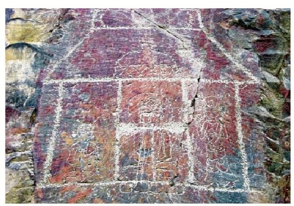 黑山巖畫中的晚期巖畫,主要反映宗教文化。紅柳溝、石關(guān)峽口巖畫中的殿堂、佛塔、佛像、古藏文題刻,可能屬于唐代中期以后的宗教遺物。藏傳佛教在 7世紀(jì)時同古藏文一起為吐蕃松贊干布創(chuàng)立。據(jù)史書記載,唐因平定“安史之亂”,河西空虛,吐蕃乘機占領(lǐng)河隴之地達(dá) 100 余年。吐蕃人居住河西,在紅柳溝、石關(guān)峽刻畫佛教殿堂、菩薩、佛像、佛塔是完全可能的。由此推斷,黑山紅柳溝、石關(guān)峽口佛塔、佛像及藏文題刻為唐中期以后的吐蕃所留。