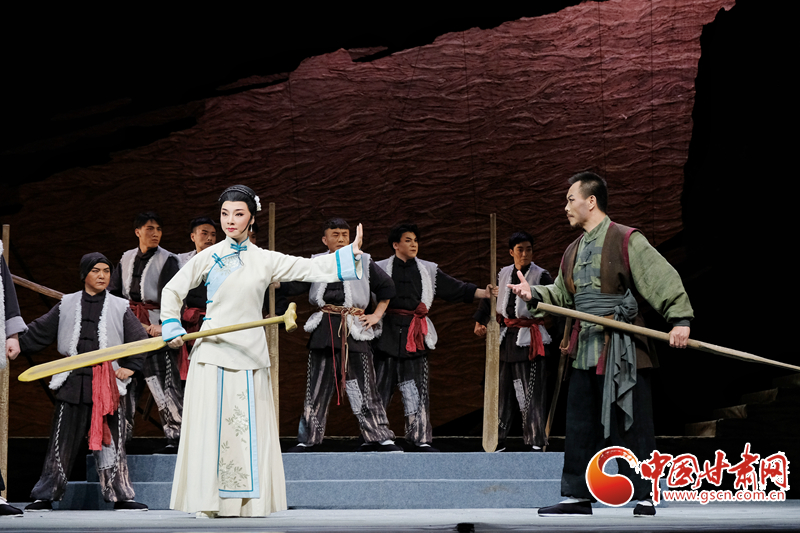 在唱腔設(shè)計上,該劇既有傳統(tǒng)的保留,也有創(chuàng)新的嘗試。在隴東老道情的基礎(chǔ)上,通過音樂和配器的創(chuàng)新,提升了音樂的張力和表現(xiàn)力。現(xiàn)場演出采用了民族管弦樂隊伴奏,使音樂更具交響性,更加豐富多彩,這也是該劇音樂方面的最大創(chuàng)新。