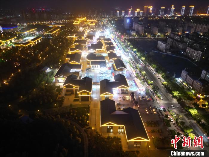 圖為明清街夜市燈光點(diǎn)亮具有武威文化元素的“天梯山石窟”彩燈。(無(wú)人機(jī)照片)  戴文昌 攝