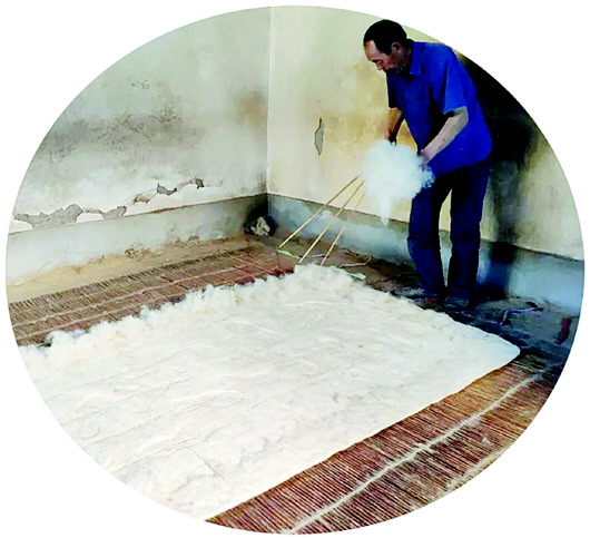 “氈匠3件寶,彈弓、竹簾、沙柳條。”工具雖簡(jiǎn)單,工序卻復(fù)雜。從選毛、稱毛、彈毛、打毛、壓毛、鋪氈、搟氈、洗氈、晾氈,再到彈、洗和揉邊,技術(shù)性很強(qiáng)。