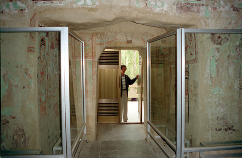 圖為莫高窟的367個洞窟安裝了鋁合金窟門,并在94個開放的洞窟安裝了玻璃屏風,即保護了壁畫的彩塑,又不影響參觀者視線。新華社記者彭張青攝(1996年11月24日發(fā))