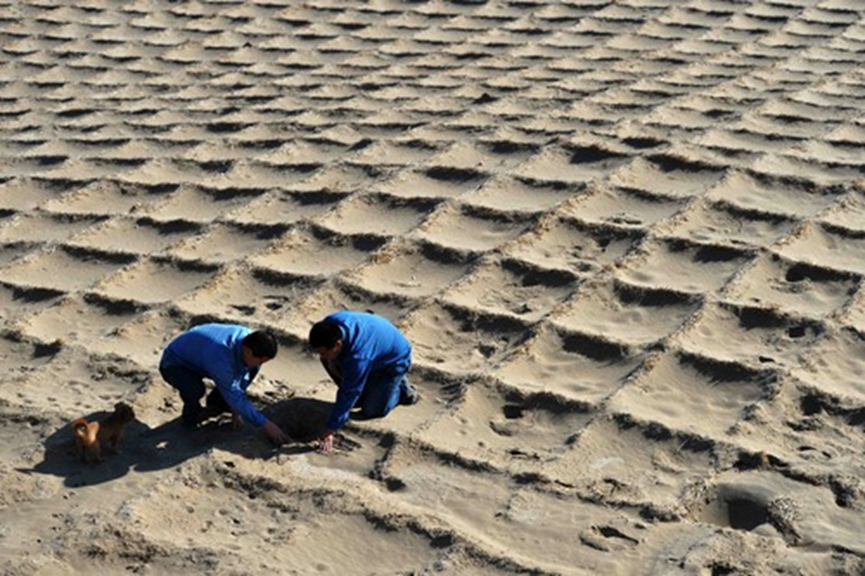 記者從敦煌研究院了解到,到2014年,經(jīng)過70年持續(xù)風沙治理,風沙對敦煌莫高窟的危害顯著降低,進入窟區(qū)年積沙量減少85%以上。據(jù)敦煌研究院保護所副所長汪萬福介紹,在幾代治沙人的努力下,莫高窟頂已形成由防沙障阻沙、沙生植物林帶擋沙、麥草方格沙障固沙和礫石壓沙組成的風沙防治綜合體系,極大減緩了風沙對敦煌壁畫和塑像等文物的危害,改善了窟區(qū)生態(tài)環(huán)境。圖為2014年8月29日,兩名工作人員檢查用于固沙的麥草方格。新華社記者陳斌攝