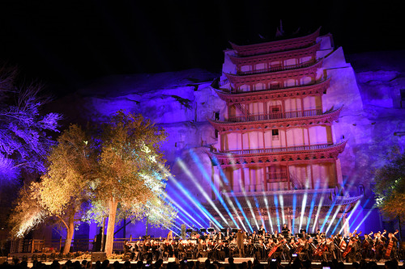 2016年9月15日,首屆絲綢之路(敦煌)國際文化博覽會系列活動之一的敦煌莫高窟1650周年紀念音樂會在莫高窟舉行。著名指揮家陳燮陽、特邀音樂家趙聰?shù)人囆g家奉上了具有絲綢之路沿線諸國特色的經(jīng)典曲目,2000余名觀眾在莫高窟九層樓廣場前追憶絲綢之路的璀璨歷史,聆聽穿越古今的藝術交響。