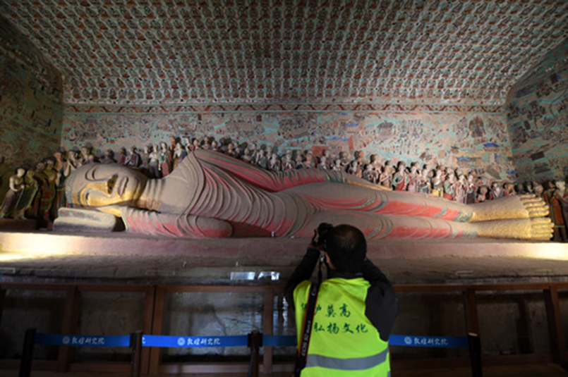2016年10月11日,百名攝影師分組分批走進甘肅敦煌莫高窟洞窟內(nèi)部進行攝影創(chuàng)作,領略莫高窟神韻。圖為當日,攝影師在敦煌莫高窟第148窟拍攝臥佛。新華社記者范培珅攝