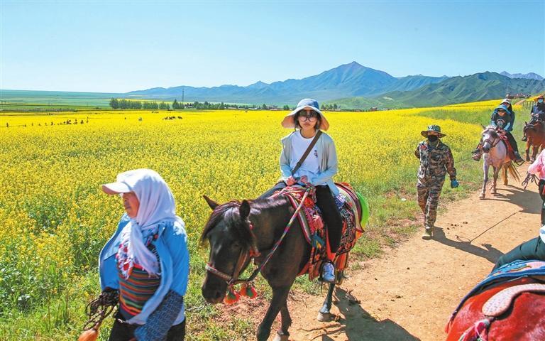 一路前行,一路風(fēng)景。一片片的油菜花開(kāi)得生機(jī)勃勃,連天接地,引得游人駐足拍照。萬(wàn)畝油菜花海隨風(fēng)起伏,如同時(shí)間長(zhǎng)河里濺起的金色浪花,游人穿行于花海中,臉上都露出了孩子般的笑容,愜意而放松……