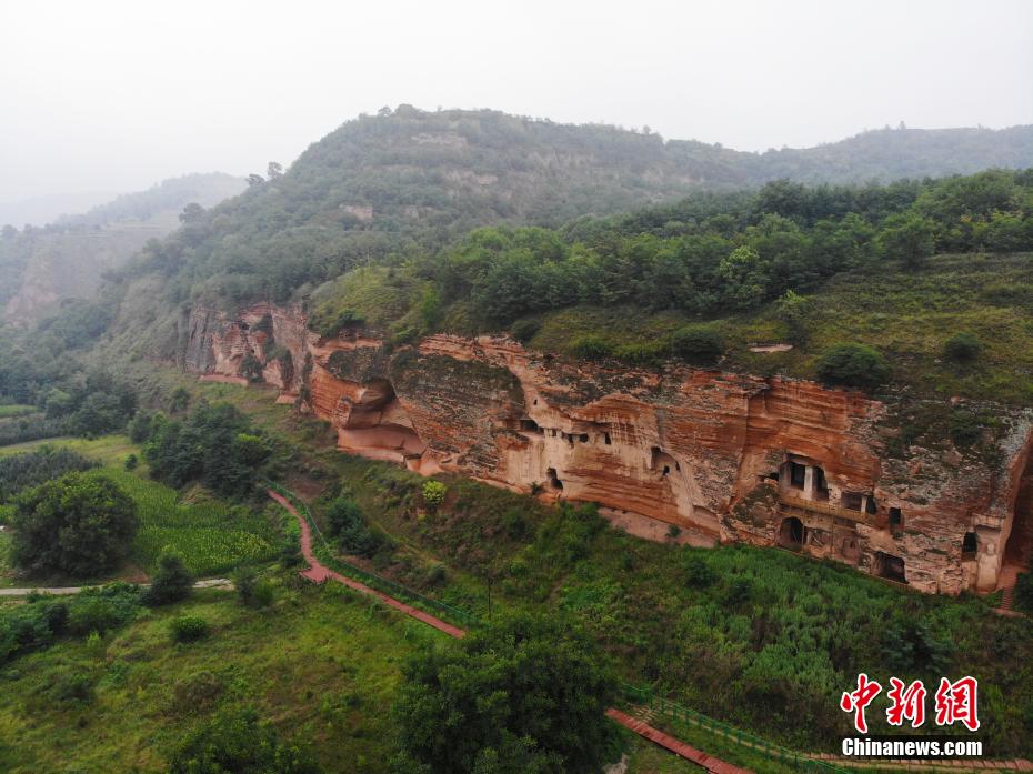 7月15日,航拍甘肅省平涼市涇川縣百里石窟長廊中的羅漢洞石窟。百里石窟長廊位于涇川縣境內,由512個石窟、5眼窟中石井組成,現存王母宮石窟、鳳凰山石窟、南石窟寺、丈八寺石窟、羅漢洞石窟、太山寺石窟等規(guī)模較大的石窟群,還有數量眾多的小石窟群。羅漢洞石窟遺存40余個窟龕,以北魏至清代風格為主。(無人機照片) 中新社記者 李亞龍 攝