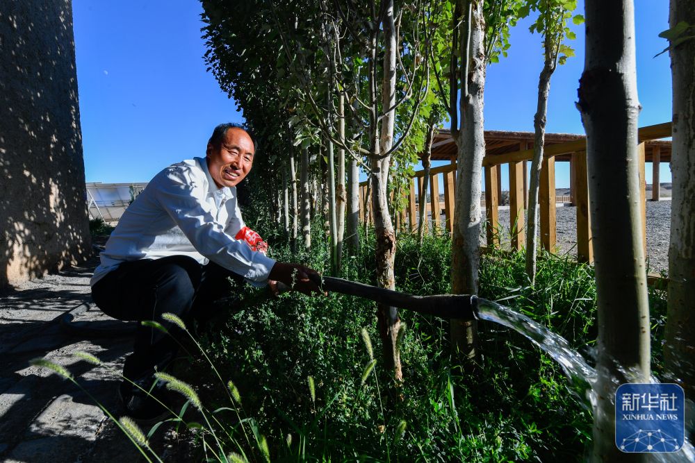 ↑7月16日,張吉全為親手栽植的白楊樹(shù)澆水。