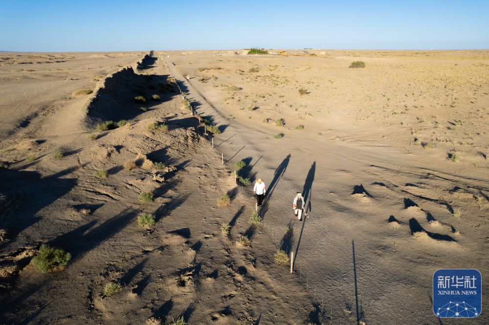 ↑7月16日,張吉全和聞春瑜夫婦沿著漢長(zhǎng)城巡護(hù)(無(wú)人機(jī)照片)。