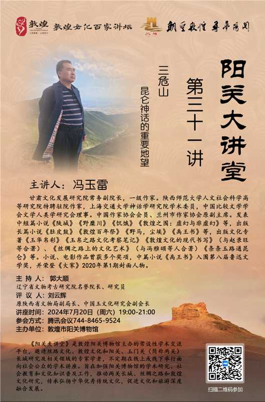 中國甘肅網(wǎng)7月18日訊 7月20日,西北師范大學甘肅文化發(fā)展研究院常務(wù)副院長、一級作家、玉文化學者馮玉雷將在線進行題為《三危山:昆侖神話的重要地望》的講座。本次講座由敦煌陽關(guān)博物館主辦,為“敦煌文化百家講壇”第31講,遼寧省文物考古研究院名譽院長、資深考古學家、玉學家郭大順研究員擔綱主持,陜西省文物局原副局長、中國玉文化研究會副會長、資深玉學家劉云輝教授擔綱評議。