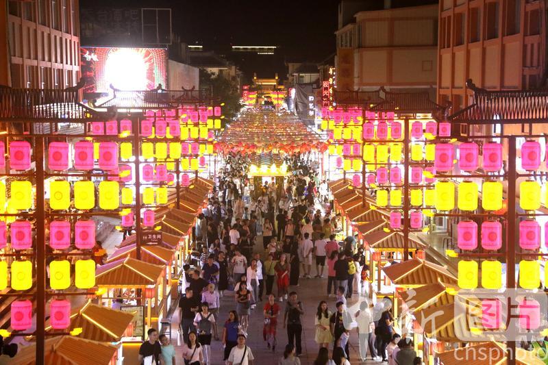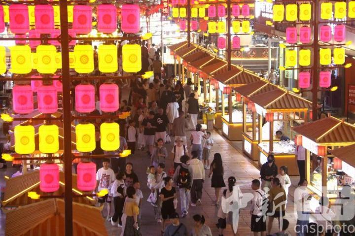 2024年8月17日,游客在甘肅省敦煌夜市游覽。進(jìn)入暑期以來,被譽(yù)為敦煌“夜景圖”的敦煌夜市日均客流量達(dá)3萬人次以上,游客在這里賞景游覽休閑,品嘗地方名優(yōu)小吃,選購敦煌特色文創(chuàng)產(chǎn)品,感受敦煌文化魅力,夜經(jīng)濟(jì)活力四射。中新社發(fā) 張曉亮 攝